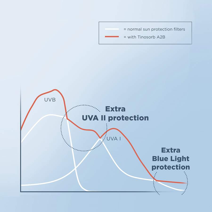 Innehåller Tinosorb® A2B – ett bredspektrumfilter som erbjuder överlägset skydd mot UVA, UVB och blått ljus.